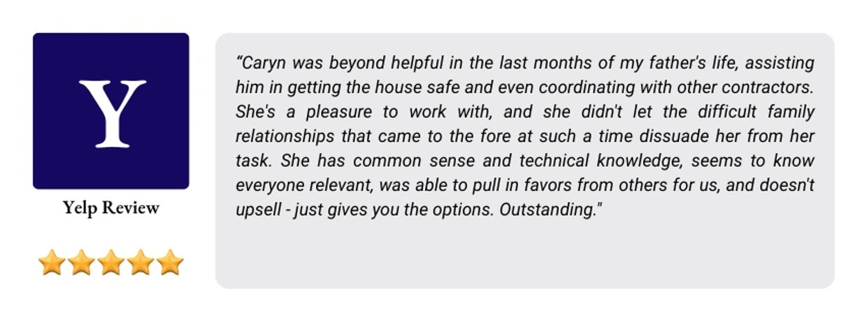 As a Certified Aging in Place Specialist, a Designation by the National Home Builders Association, Caryn can recognize potential problems and provide practical answers. With over 20 years of experience as a Social Worker and senior service provider, she is an expert in fall prevention, senior care options, and accessible home modifications. Caryn offers in person or virtual in-home and business solutions addressing accessibility issues confronting seniors and people with disabilities. With Caryn's background in construction, she can coordinate, supervise, or refer contractors for the needed work.